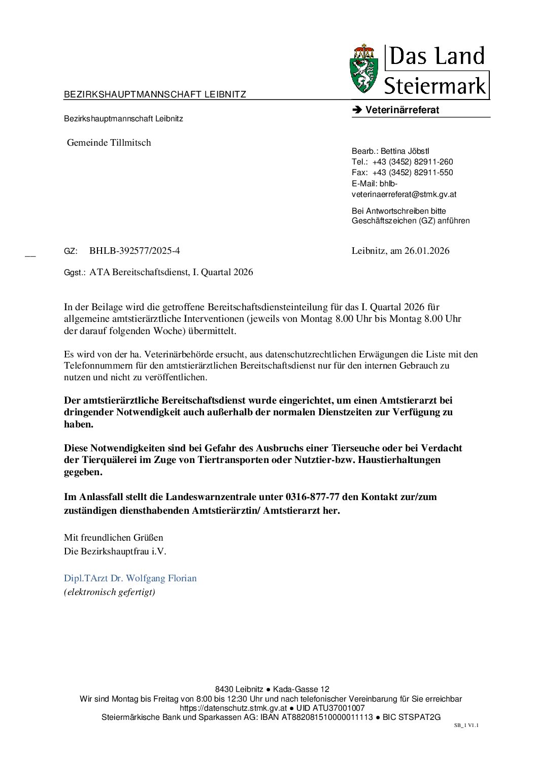 Amtstierärzte Bereitschaftsdienst 1. Quartal 2026